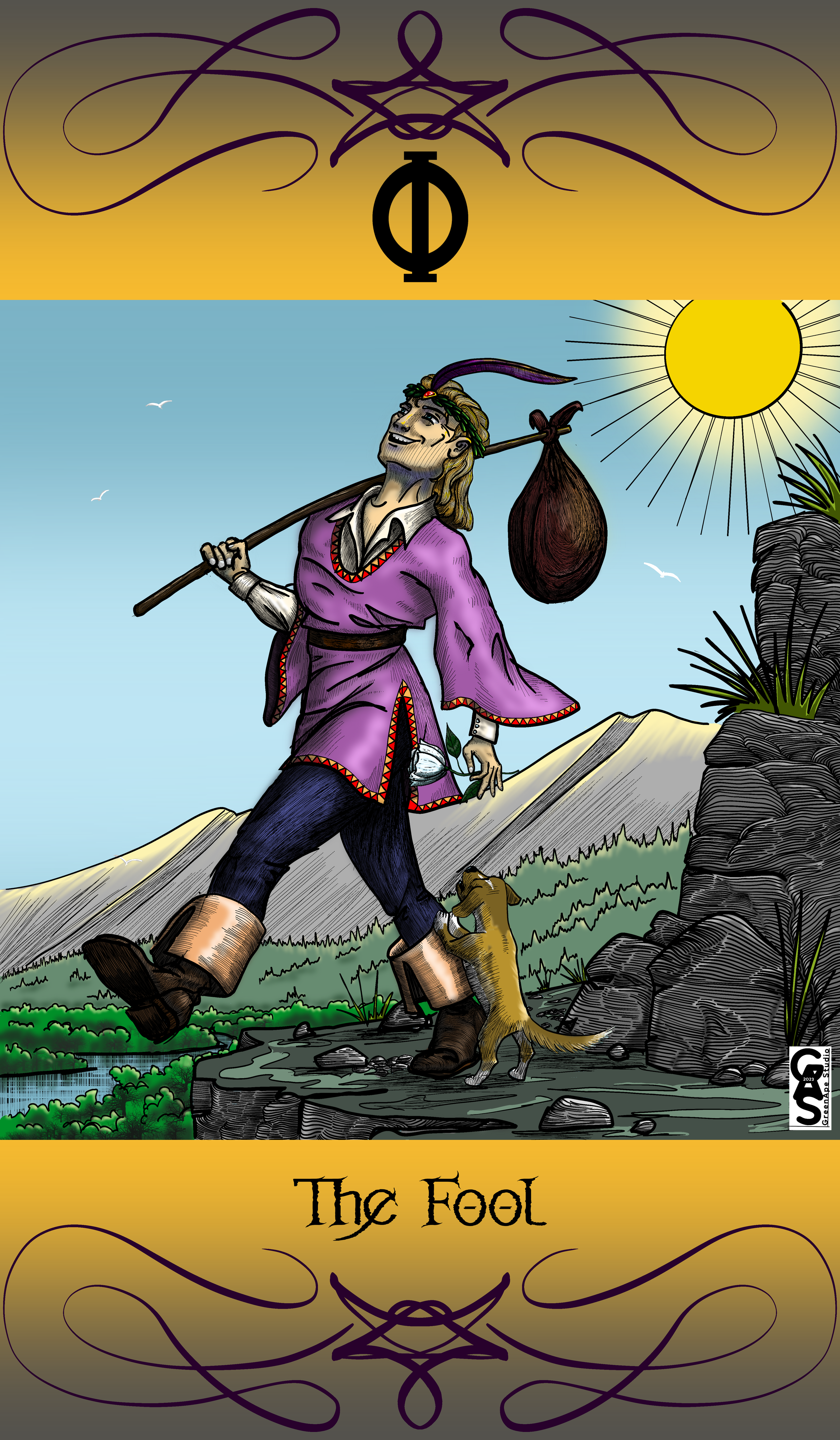 After many delays, diversions and other inconvenient things starting with “D”, not to mention Christmas, I am pleased to present the “0” card of the Major Arcana, “The Fool”.