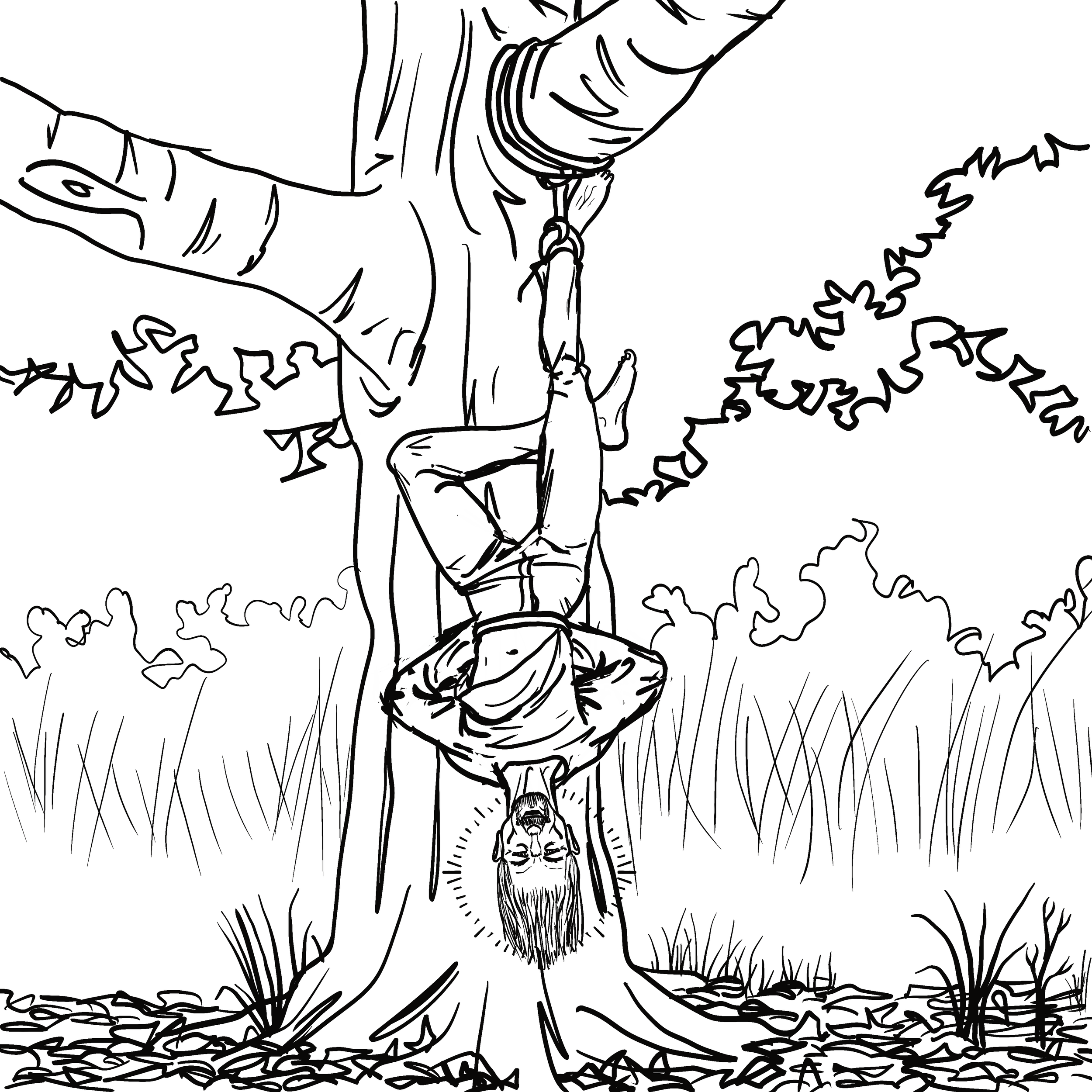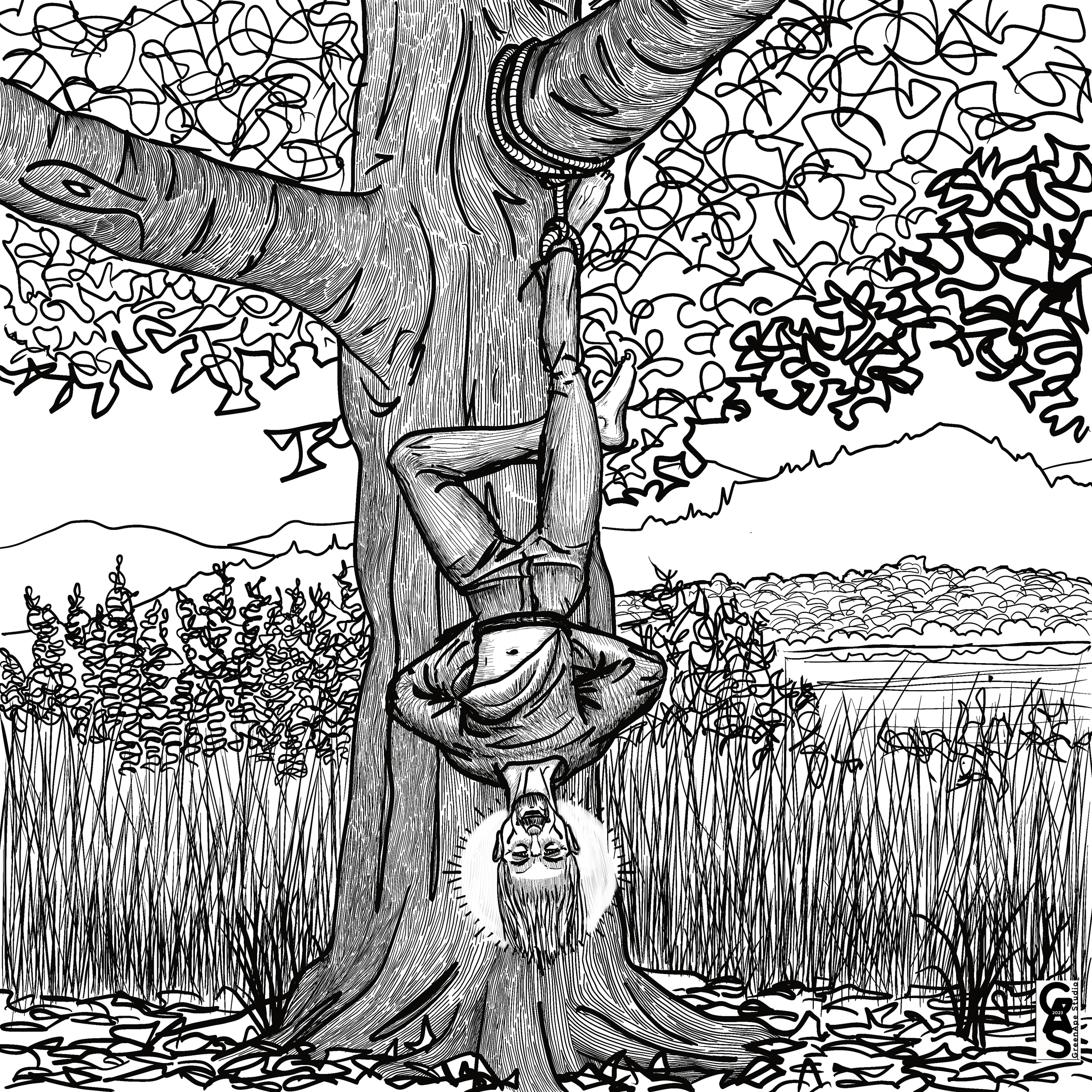 The finished line work for the Hanged Man card. Rather than stay with the simple “T” shaped tree from the Rider-Waite-Smith deck, I decided to opt for a more scenic look.