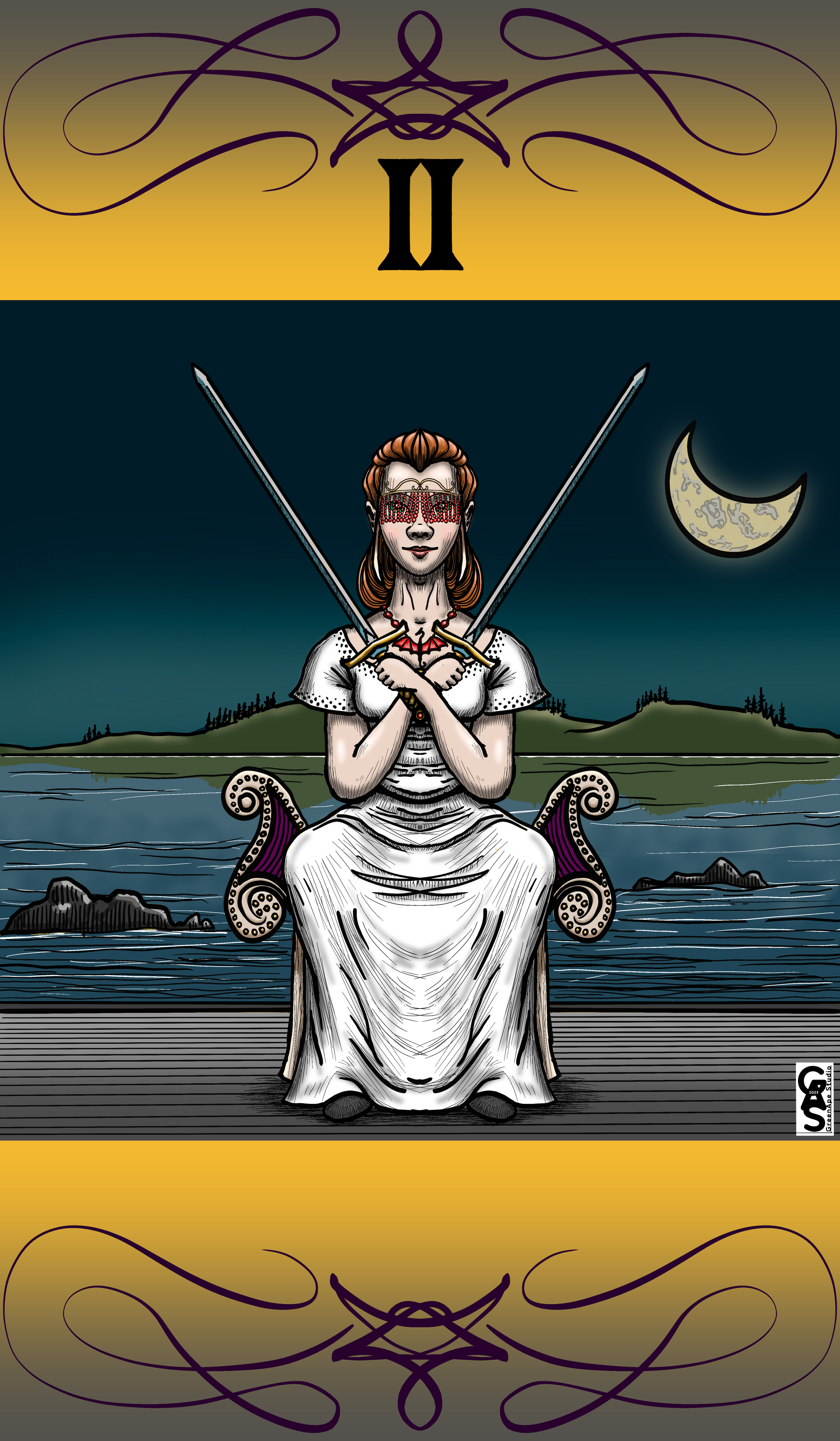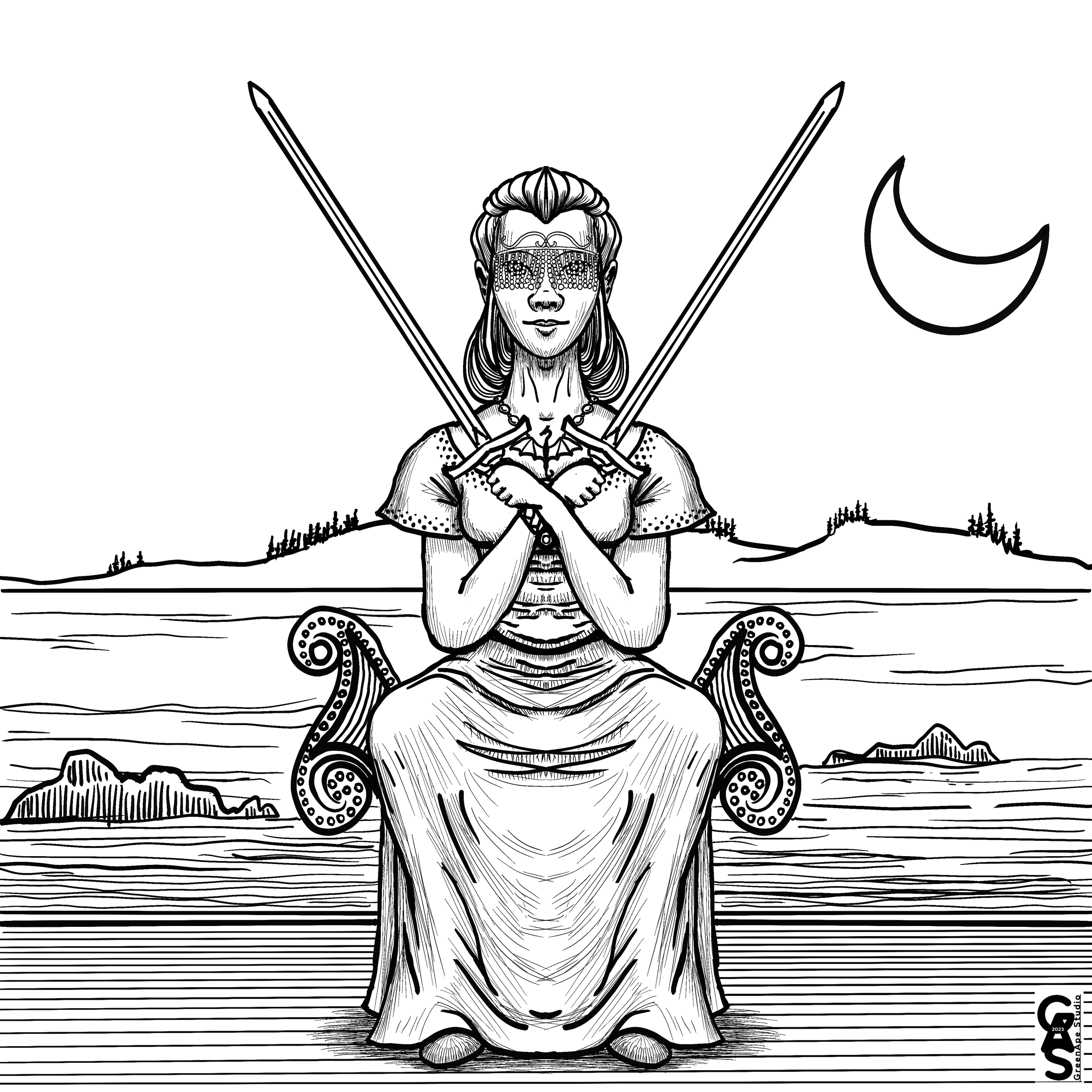 The next card in the project is the Two of Swords. This one was a pretty easy composition and I stayed fairly close to the Rider-Waite-Smith layout. Probably the most significant change involved swapping out the plain blindfold for a beaded veil. Here is the linework and timelapse video for this one.